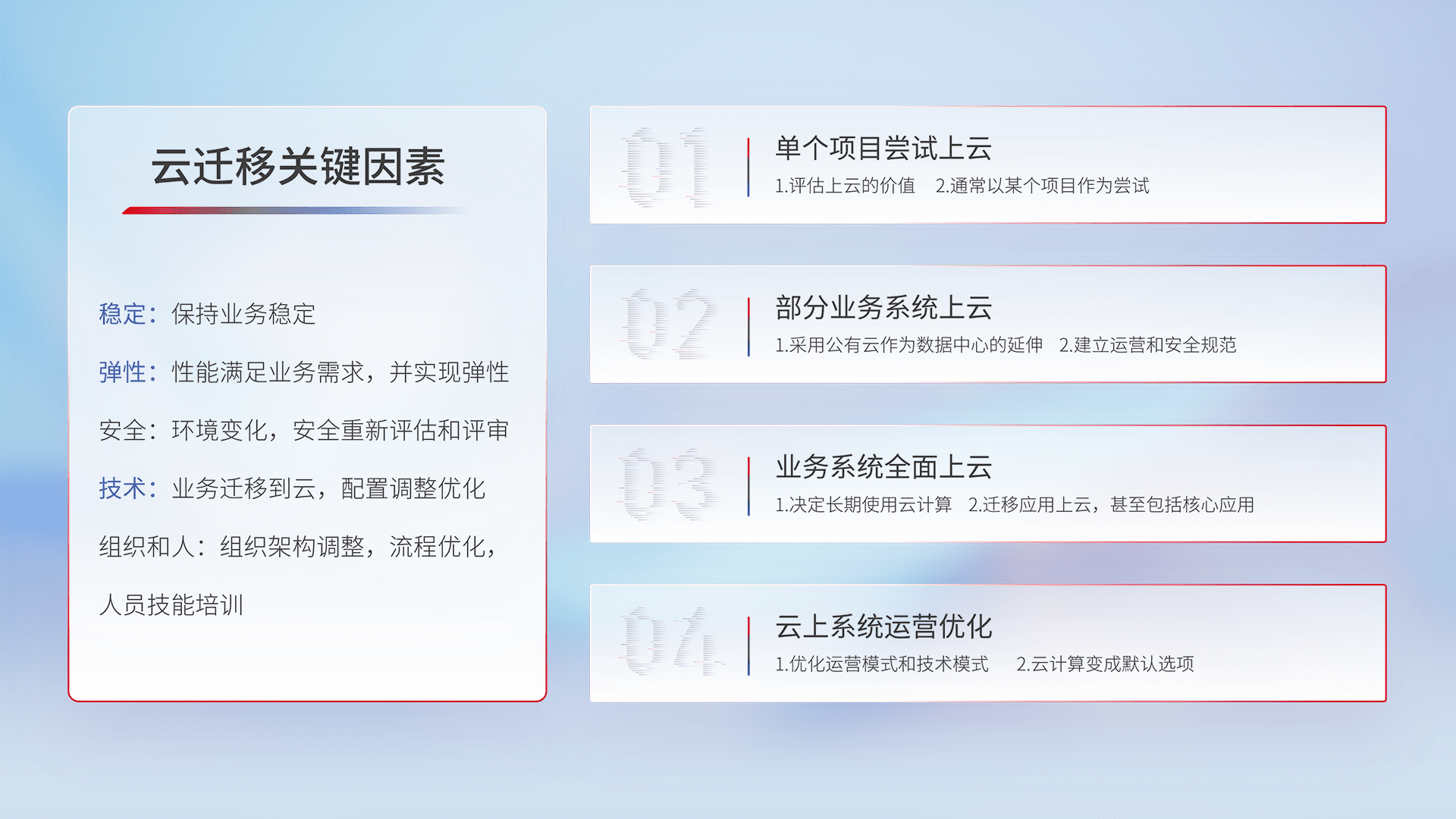结合实际业务,,从规划设计、、、云平台选型、、、、云原生改造、、、数据迁移、、、、集成交付,,,迁移全过程为客户识别最佳上云路径,,做好风险识别管理,,,,设计网络架构、、身份权限、、、安全审计合规、、、、操作审计、、日志审计、、、监控告警策略、、、多站点容灾设计等,,,对云上基础设施进行整体规划,,提升IT治理水平,,,以满足弹性、、、高可用、、高性能的需求。。。