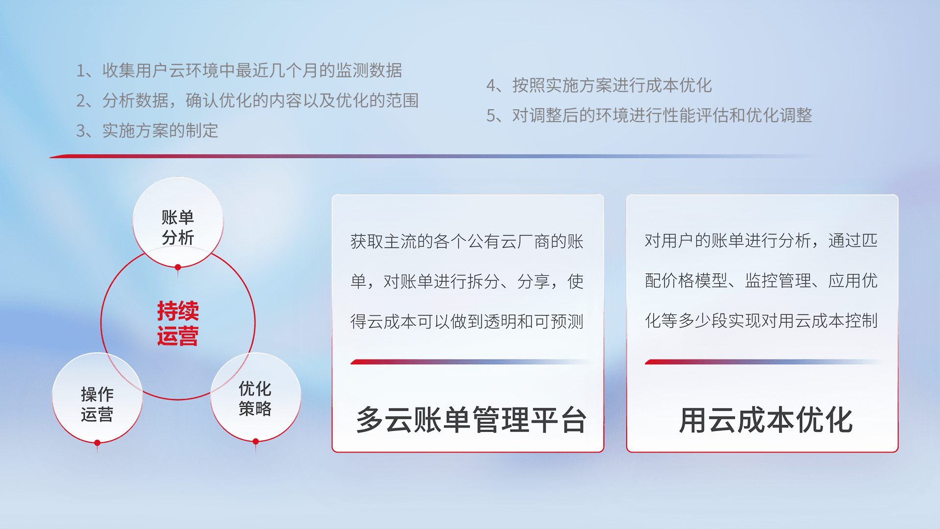 通过多云纳管,,,以统一的资源数据模型把客户的云资源进行抽象和封装,,,进而实现对多云资源的统一操作,,,保障云资源管理的可靠性、、、、稳定性与可用性。。。量身定制化运维内容,,配置、、、、开发运维、、、补丁管理、、备份、、、、监控、、认证和访问管理、、、审计和日常巡检等,,,,保障在用云过程中的可靠度,,,稳定度以及高可用率。。。