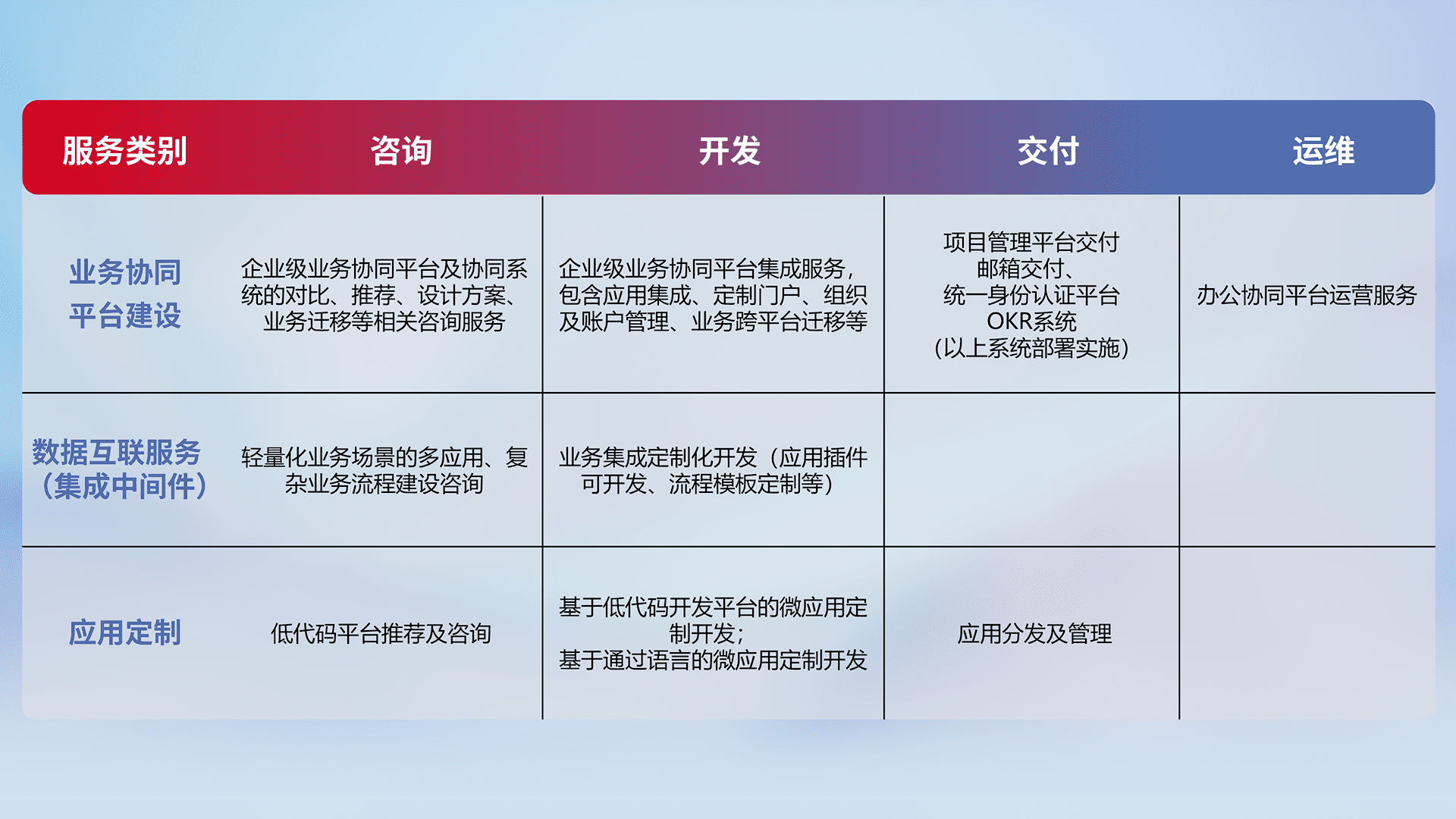 针对钉钉、、企微、、、IDaas等平台级产品提供产品的规划、、方案、、、交付、、、、定制化开发等服务,,,,实现如统一协同办公、、、、智能客户服务、、混合会议管理、、、、智能数据查询、、等业务场景,,,,实现数字化转型。。。。